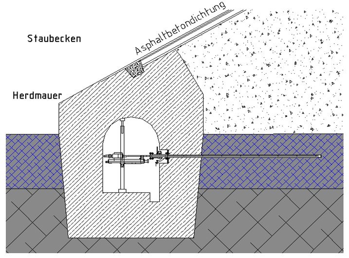 Zur Druckentlastung einer Dammabdichtung waren von der Herdmauer aus nachträglich Bohrungen herzustellen, um Drainagerohre einzubauen.